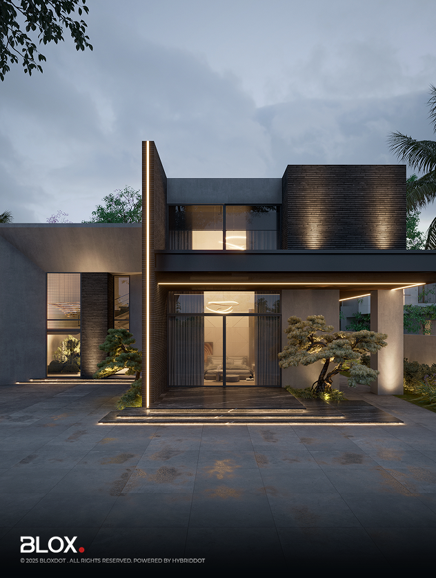 The façade embraces symmetry while introducing layered volumes that provide spatial hierarchy and privacy. Lush landscaping and curated trees soften the minimalist geometry, while full-height glazing opens the interiors to natural light and surrounding greenery.