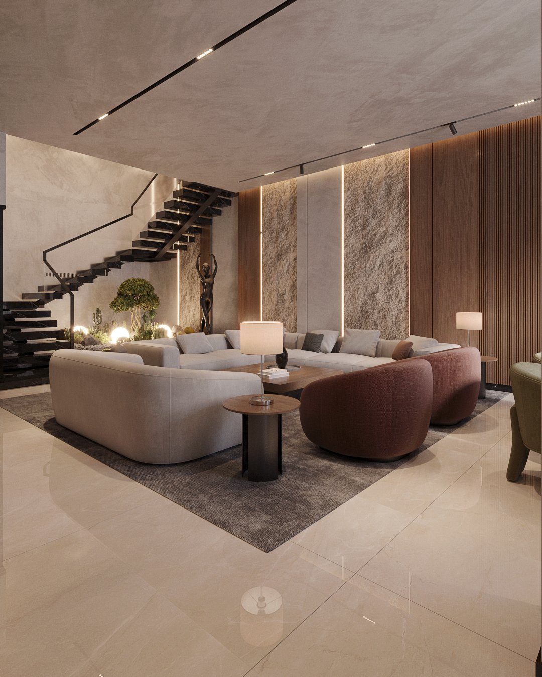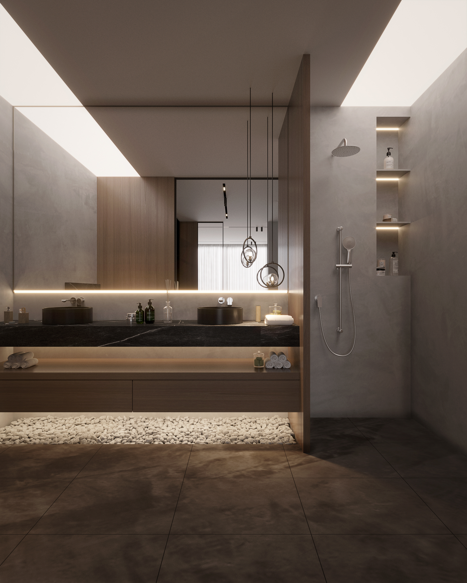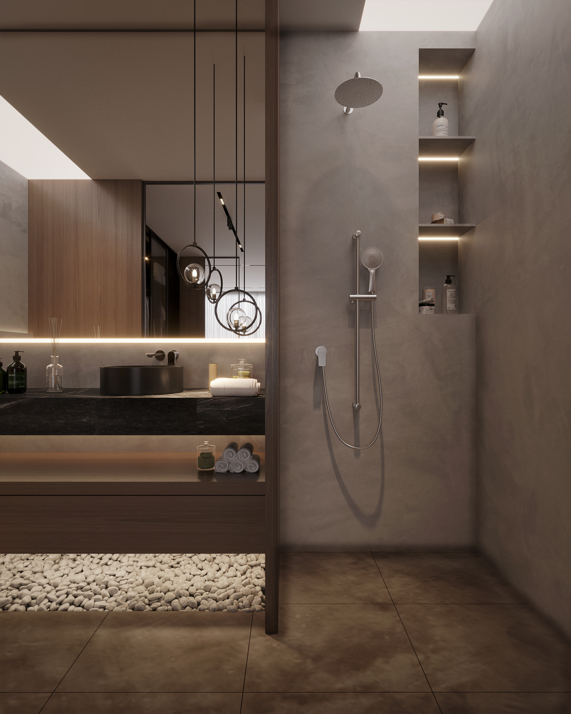 Inside, textures stay quiet. Matte surfaces, warm finishes, and minimal built-ins let light and layout speak. A carefully selected palette of neutral-toned stone, textured finishes, and warm accents lends the home a sense of permanence and calm.