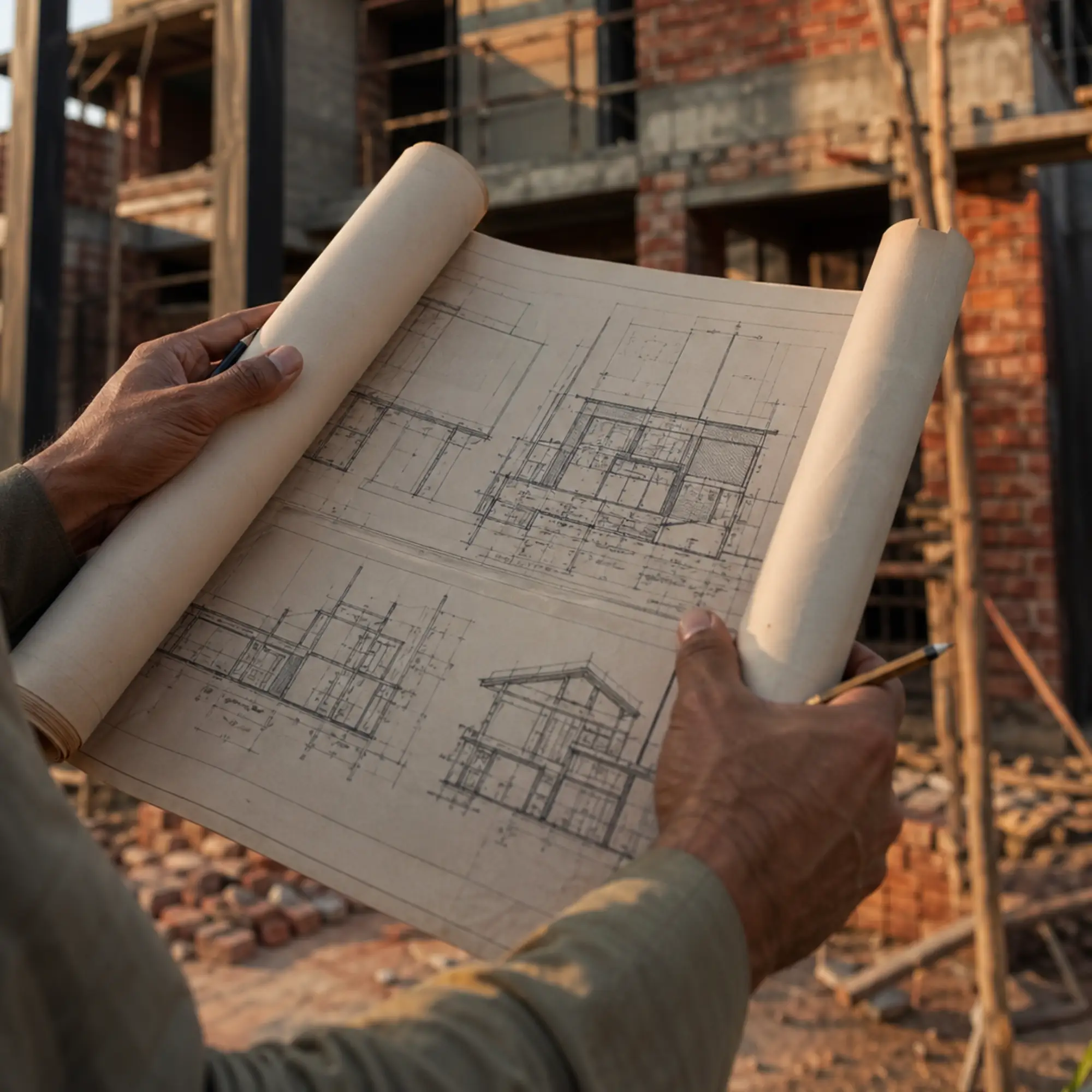 The architects who drew the project, watching it get built. Site visits, drawing reviews, and quality oversight from kickoff to handover.